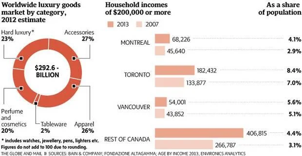 Montreal is affluent enough to support a Saks store. The city has a substantial number of high-earning households as well as high net-worth households. The Globe & Mail provides data showing Montreal as having the second-highest number of households earning over $200,000 in Canada (we won't mention Quebec's high income taxes). At the same time, Montreal lacks many of the free-standing luxury stores found in Toronto and Vancouver. Some of these luxury boutiques (e.g. Cartier, Gucci, Burberry, Versace, Salvator Ferragamo) could be located within a new Montreal Saks store.